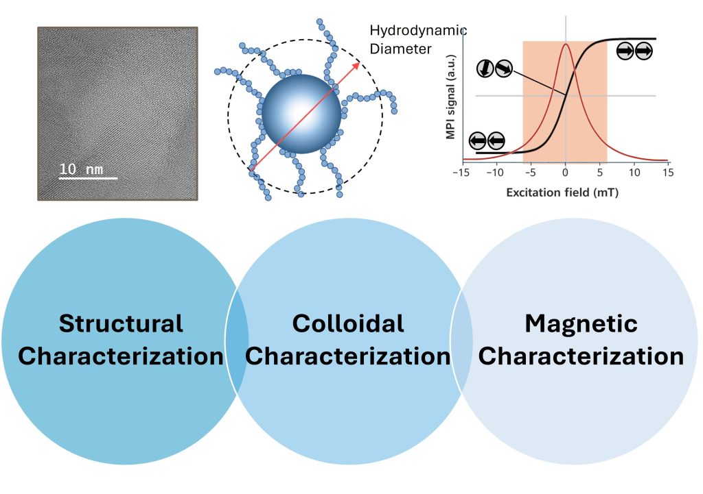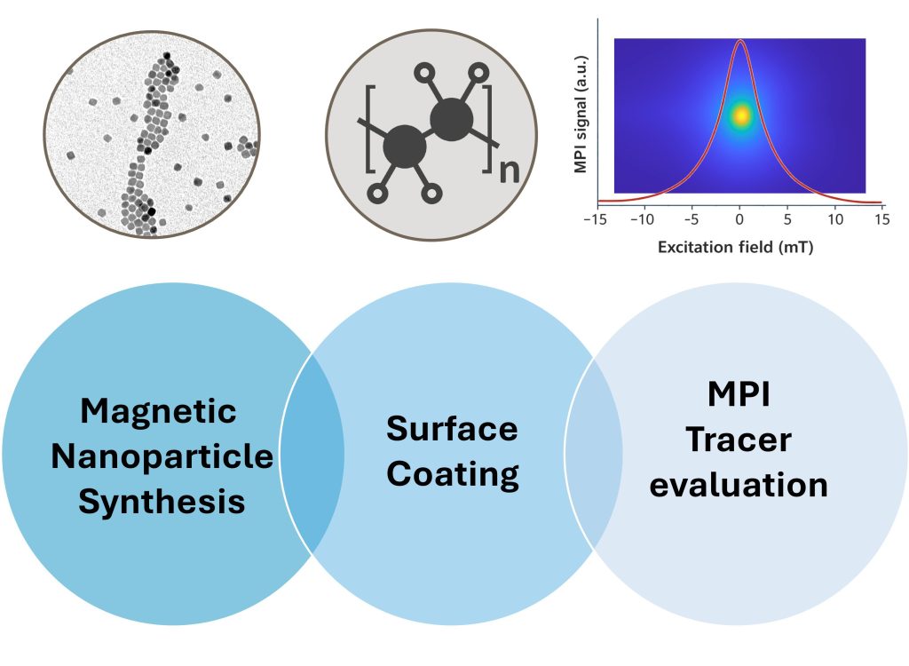 This WG focuses on the optimization of magnetic nanoparticles (MNPs) as tracer materials in MPI, with particular emphasis on their magnetic properties to achieve a strong imaging signal while ensuring clinical feasibility. For advanced MPI applications, additional characteristics and functionalities may be required, such as efficient heat transfer for hyperthermia (see Goals of WG3 in the Table below). WG 3 addresses the following tasks: reviewing the literature; mapping current technological advances in MNP synthesis relevant to MPI applications; developing and optimizing MNP synthesis strategies; and performing comprehensive characterisation and evaluation of MNPs, all in close cooperation with WG1, WG2, and WG4.
